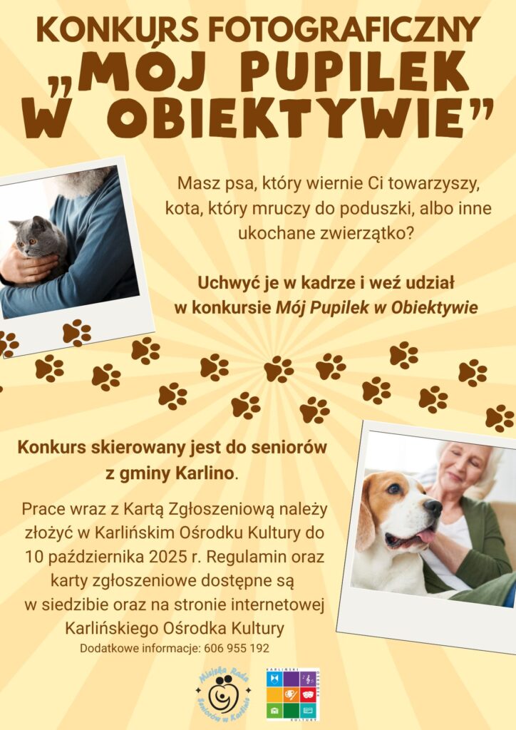 Miejska Rada Seniorów w Karlinie ogłasza konkurs fotograficzny skierowany do seniorów z gminy Karlino. Masz psa, kota albo inne ukochane zwierzątko? Uchwyć je w kadrze i weź udział w konkursie fotograficznym „Mój Pupilek w Obiektywie”.